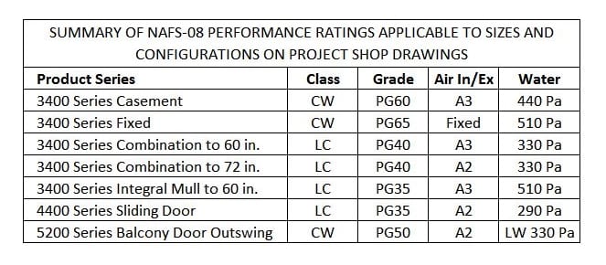 There are several ways to add NAFS performance rating information to shop drawings. One way is to add a table to the cover sheet or a notes page. More or less detail can be provided, depending on factors such as whether the project specifications call for the manufacturer to provide engineer-stamped shop drawings and letters of assurance. In such a case, the windows and doors will be designed to meet the project wind loads on the basis of the engineer’s design, and not on the basis of Performance Grades determined using the simplified methods of the Canadian Supplement.