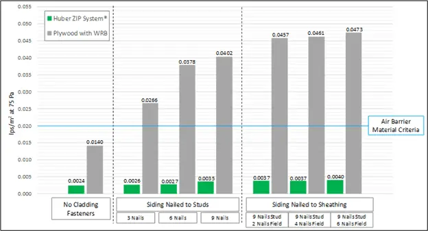 - The taped sheathing with integrated air and water barrier remained very airtight after all 15 cladding fasteners were applied—still lower than the material air barrier requirement.
