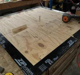 To prepare the test subjects for Phase 2, the research team cut the weathered materials into identically constructed sub-assemblies so there was a T-joint in the sheathing, framing on the back, and attachment of the sheathing to the framing with nails. The ZIP sheathing assembly had taped joints, and the OSB and housewrap assemblies had Tyvek attached with cap staples. The test subjects followed all the manufacturers’ recommendations and relevant building code requirements to prepare the sub-assemblies. See Figures 5 through 8.