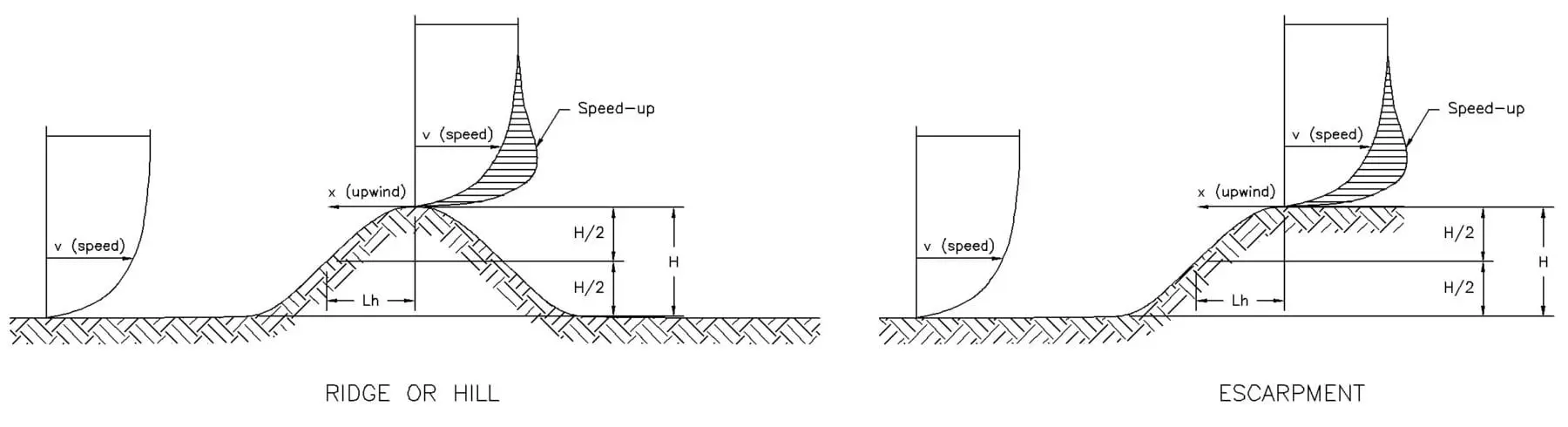 The engineers who prepared the Alberta Guideline document are licensed to practice in the United States as well as Canada, and are familiar with the more extensive resources on wind-related pressures present in American standards, specifically, in ASCE-7, “Minimum Design Loads and Associated Criteria for Buildings and Other Structures”, a standard published by the American Society of Civil Engineers. The guidance in the Alberta Guideline on when wind speed-up over hills should be considered comes from this standard.